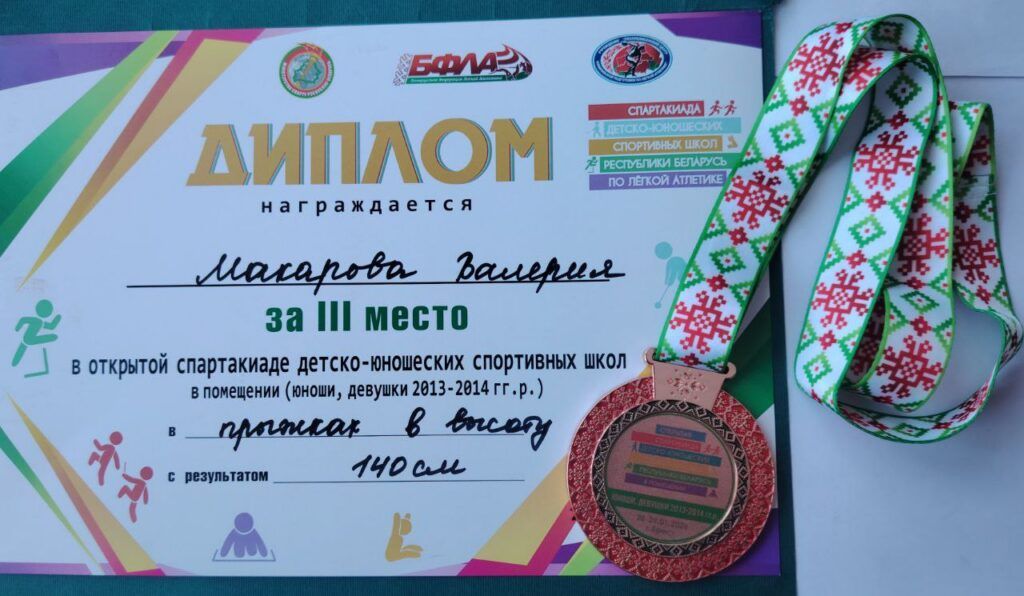 Воспитанница Узденской ДЮСШ Валерия Макарова (девочке 12 лет) в соревнованиях по прыжкам в высоту показала результат 140 см и заняла 3 место – став бронзовым призёром Республики Беларусь.