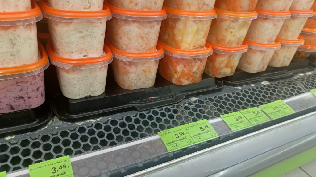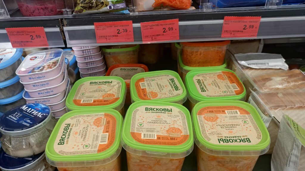 Килограмм квашенной капусты с клюквой и морковью в райповском магазине стоит 5,36 рубля. На момент посещения в наличии данного товара не было. «Разобрали, – отметили продавцы. – Должны привезти. Такая капуста у нас не задерживается, разбирается практически сразу. Поэтому заказы на ее делаем регулярно».