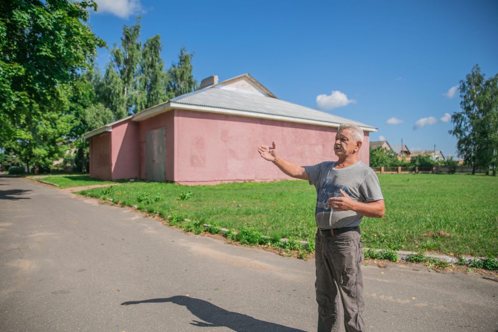 Валерий Кириллович подводит к расположенному неподалеку зданию. Когда-то это была общественная баня. Помещение давно уже не использовалось по назначению, приобрело неприглядный вид: разломанная крыша, кирпичная укладка местами развалилась, вокруг-мусор, сорняки. Еще несколько лет, и остались бы на этом месте одни развалины. Осмотрев здание, специалисты пришли к выводу, что ему можно еще придать вторую жизнь. Не один месяц работали свои работники и строители из Столинщины, и вот результат — сейчас здесь хороший гараж для четырех служебных автомобилей агрокомплекса”Белая Русь».