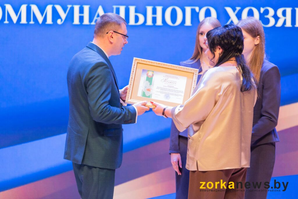 На празднике наград были удостоены и представители нашего района. Благодарственные письма райисполкома за многолетний добросовестный труд глава района Дмитрий Колос вручил старшему мастеру производственного участка Ольге Есемчик и приёмнику заказов КПП «Хотляны» Зинаиде Драпей.